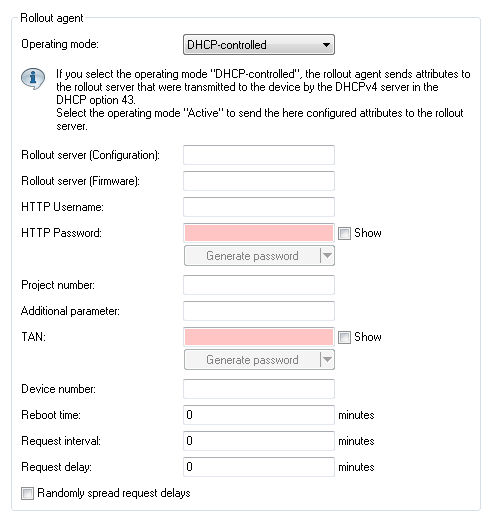 Note: The "DHCP-controlled" operating mode does not overwrite manually configured attributes. This makes it possible to perform a comprehensive pre-configuration based on the latest contact information for the rollout server (address, login data) as communicated by the DHCP server.