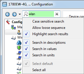 3. In the search box, type the phrase that you are looking for e.g. wlan. Searching is not case-sensitive. You can enter parts of words or numbers, as well as complete strings. If there are spaces in the search string, then only strings containing the matching spaces will be searched for. The search function does not support wildcards.