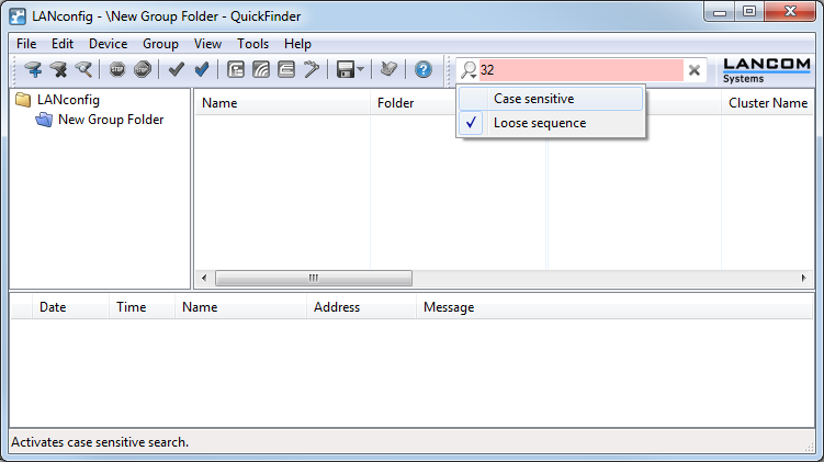 In the main view of LANconfig, the QuickFinder is located in the toolbar. Entering a search term in the search window reduces the number of available devices in the list. LANconfig searches through all the values available in the columns in the device list, including any hidden columns. Click on the icon next to the magnifying glass to make the search case sensitive.
