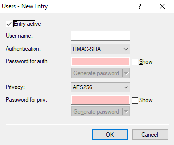 Individual users can be granted access to the device in addition to the administrators registered on it. Here you configure the authentication and encryption settings for these users when operating SNMPv3.