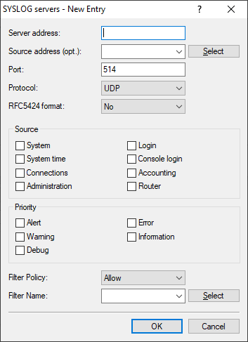 - You can optionally specify a source address that the SYSLOG client uses as the target address, instead of the one that would normally be selected automatically. If you have configured loopback addresses, you can specify them here as sender address.