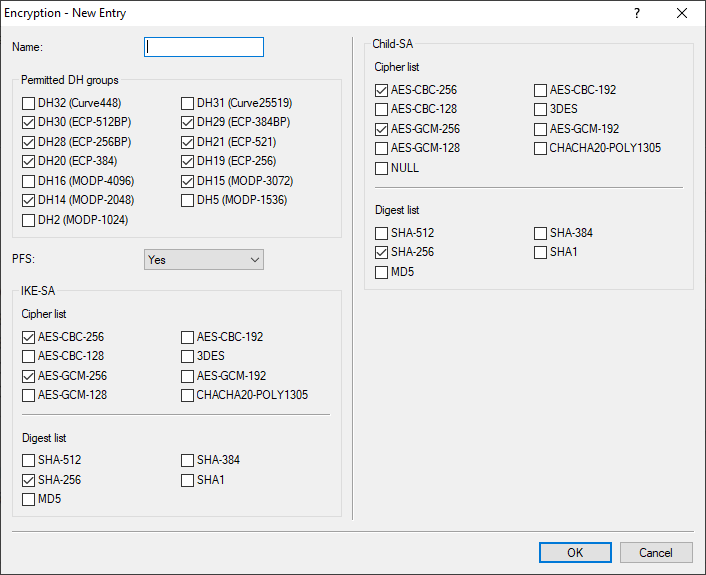 Multiple parameters can be selected. The device propagates these parameter lists in the IKE protocol and in CHILD SAs. The two VPN partners agree to use one of the algorithms in the propagated lists. While they are establishing the first IKE SA, the VPN partners agree to use the highest of the mutually propagated DH groups. The VPN partners use this DH group when they renew the IKE SAs, or when they create or renew the CHILD SAs (if PFS is enabled).