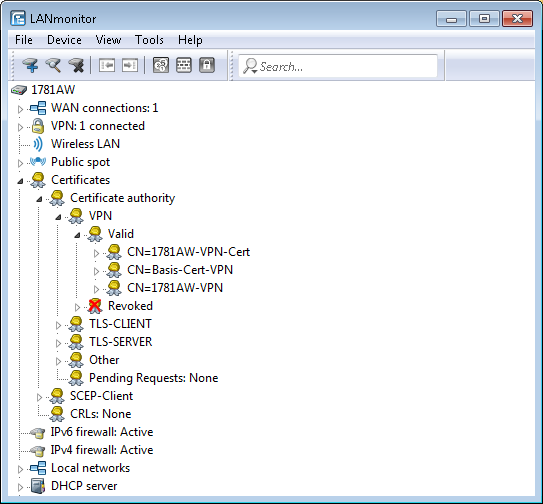LANmonitor displays the active and revoked certificates, as well as the certificate requests from the SCEP clients.