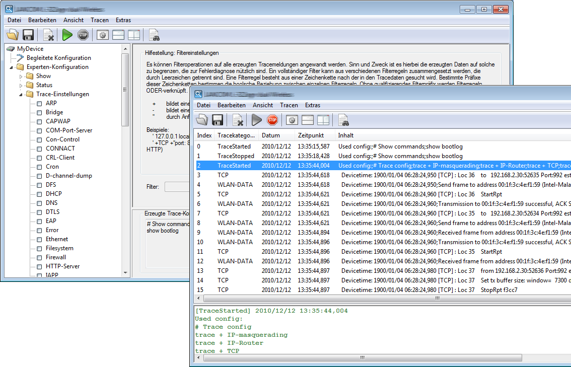 The trace function in LANconfig and LANmonitor goes beyond the standard trace functions available at the command-line interface and offers greater convenience in the generation and analysis of traces. For example, a trace configuration that activates the relevant trace commands can be stored to a configuration file. An experienced service technician can set up a trace configuration and provide it to a less experienced user for executing specialized trace requests for a device. Also, the trace results can be saved conveniently to a file for return to the technician for evaluation.