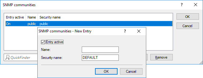 For SNMPv1 or SNMPv2c, you force the entry of login data for SNMP read-only access by disabling the public community in the list of the SNMP communities. This setting only allows information about the state of the device, current connections, reports, etc., to be read out via SNMP after the user authenticates at the device. Authorization can be conducted either with the administrator-account access credentials or an access account created for the individual SNMP community.