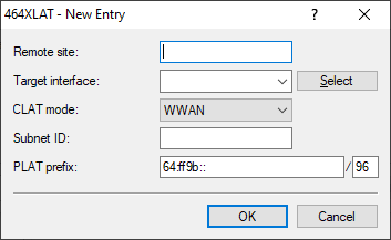 - If the Internet connection is a cellular connection (WWAN), the CLAT mode WWAN must be used. The CLAT prefix is formed from the /64 WAN prefix. The subnet ID must be 0 or empty. NAT must be enabled in the IPv4 routing table for the WAN connection.