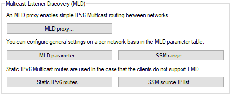 MLD is configured with LANconfig under Multicast > IGMP / MLD > Multicast Listener Discovery (MLD).