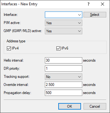 - Here you specify the address family for which PIM or GMP should be enabled on this interface. If necessary, you can also activate both types of address at the same time. Possible values: IPv4, IPv6
