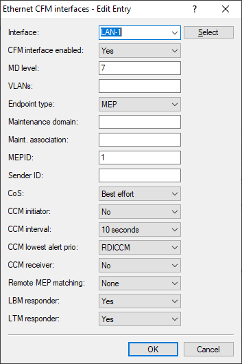 Example: To use CFM Ethernet Ping, a minimal configuration in the Ethernet CFM Interfaces table is required. On the second device, a corresponding configuration is also necessary; however, the MEPID must differ or be unique. In this example, MD-Level 7 is used.