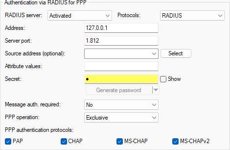 6. Configure the necessary settings for Authentication via RADIUS for PPP: