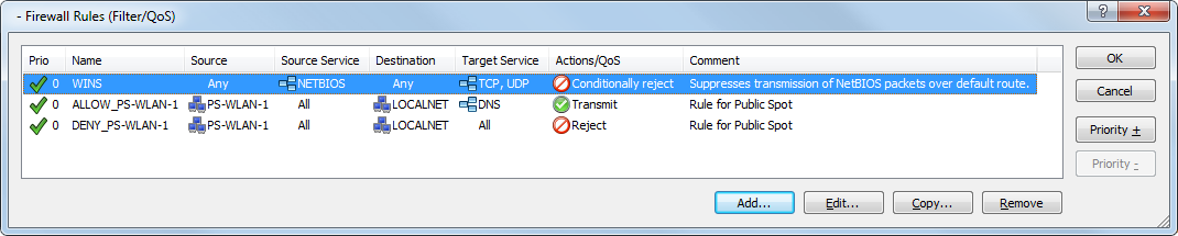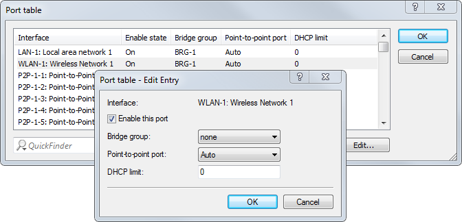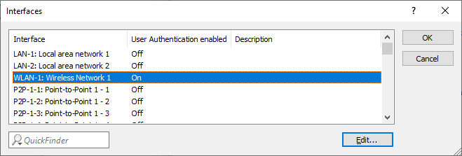 Here you activate the interfaces which will be available to registered users. Along with the logical WLAN interfaces which Public Spot users directly login to, the logical LAN interfaces (LAN-1, etc.), and the point-to-point connections (P2P-1, etc.) can also be selected. When connected via the LAN or P2P interface, additional access points can be integrated into the Public Spot provided by another device. For a single access point, on the other hand, you select, for example, the logical WLAN interface WLAN-1.