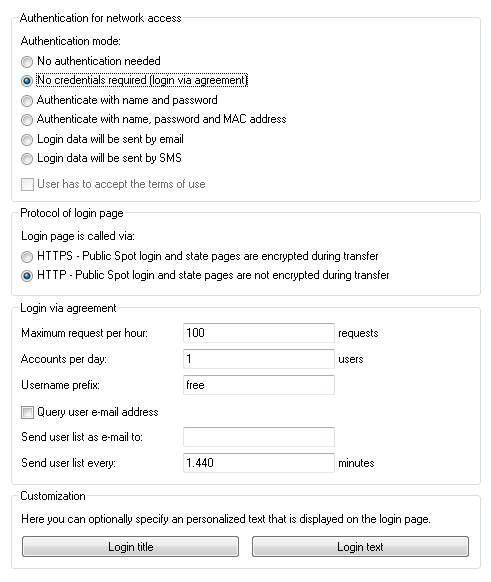 The authentication method that you select determines the information which users of the Public Spot WLAN must enter when logging in. Select Authenticate with name and password to allow your users the option to login with an individual username and password that you have previously assigned them. This setting also allows you to quickly provide Hotspot access to your guests using vouchers (tickets).