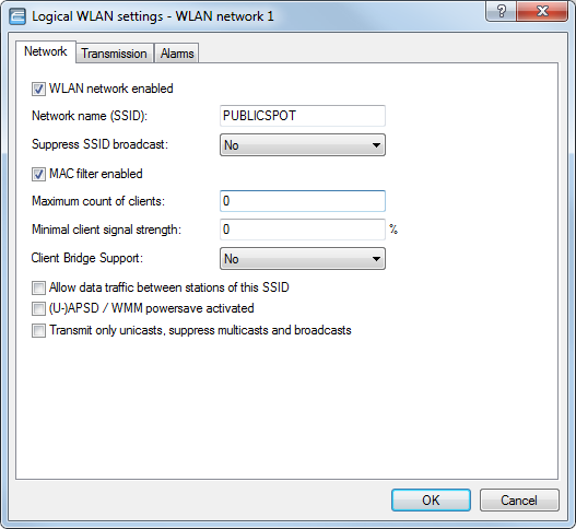 Activate the logical WLAN which you enabled for the Public Spot login and assign a descriptive name to this network (SSID).