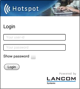 A component of the pre-installed pages in the device is a header image (logo), which is displayed to your users above the login form for the Public Spot. You can change this header image as you please, for example to reflect the application environment or your corporate design. There is no need for an external Web server; you can simply upload the image directly into the device via the file management in WEBconfig or the configuration management in LANconfig.