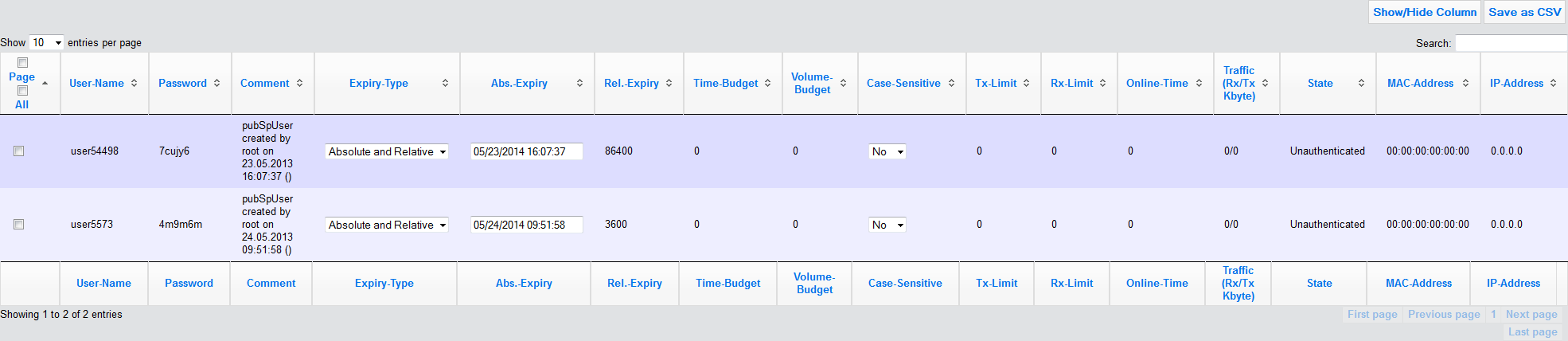 The following section describes how to use WEBconfig to manage the registered Public Spot users.