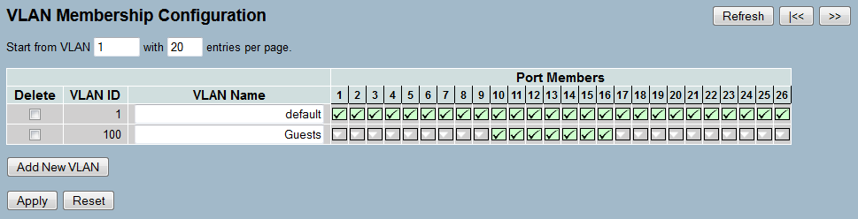 To differentiate between the VLANs in the switch, two groups are used. The internal network for the employees is mapped to the group default, and that for the guests is mapped to the group guests.