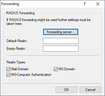 In the default state the forwarding table has no entries, i.e. the default and empty realms are empty. This means that all requests are treated as local requests and any realms which are communicated are ignored. To operate the LCOS RADIUS server purely as a forwarding server or RADIUS proxy, the default and empty realms must be set to a value that corresponds with a server defined in the forwarding table.