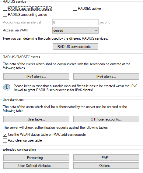 The configuration of the RADIUS server requires the specification of the authenticator that can access the RADIUS server, the password required for this access, and the open port that is specifically used to communicate with the RADIUS server. The authentication port applies globally for all authenticators.