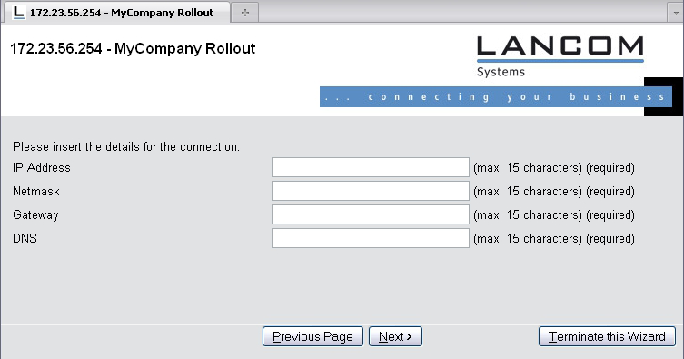 On this page, the wizard asks the user to provide values for the IP address, netmask, gateway and DNS server. All fields are required to run the wizard.
