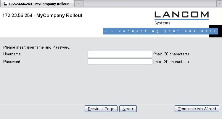 stringtable "German" string title_MyCompany, "MyCompany Rollout" string txt_Welcome, "Welcome to the MyCompany Rollout Wizard" string dev_serial_number, "Serial number" string dev_type, "Device type" ;---Page: What type of connection string inet_Selection, "Internet connection type" string inet_PPPoE, "PPPoE" string inet_IPoE, "IPoE" ;---Page: IPoE string inet_ipoe, "Please enter the details for the connection." string con_ipaddress, "IP address" string con_subnet, "Net mask" string con_gateway, "Gateway" string con_dns, "DNS" ;---Page: PPPoE string inet_pppoe, "Please enter your username and password." con_username string, "username" string con_password, "password" --- Page: End string end, "The configuration is now complete."