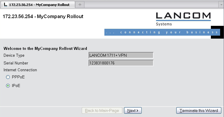 wizard "MyCompany Rollout", str.title_MyCompany section ;---Start--- static_text str.txt_Welcome readonly_text device_string description str.dev_type readonly_text device_serial_number description str.dev_serial_number selection_buttons select_inet description str.inet_Selection button_text str.inet_PPPoE, str.inet_IPoE on_show set wizard.device_string, device.DeviceString set wizard.device_serial_number, device.SerialNumber on_next