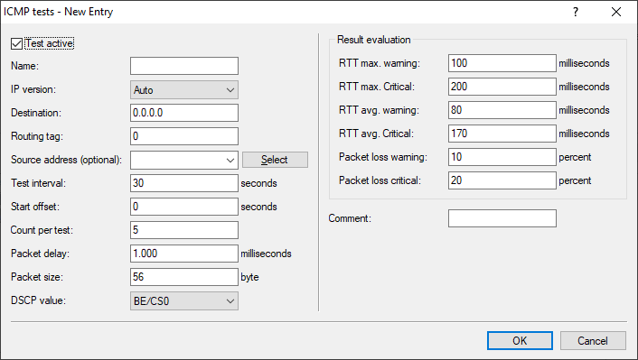 Click the button ICMP tests, add new queries and set guideline values for the connection tests.