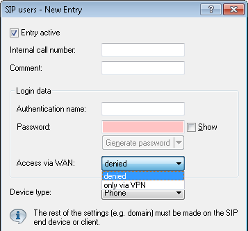 To restrict or prevent the SIP registration at the Voice Call Manager over a WAN connection, navigate to and click the button SIP users. The SIP users configuration dialog features a parameter that controls this. You can enable access via VPN, or prohibit it completely.