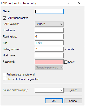 - Here you configure the name of the L2TP endpoint configured in the L2TP endpoints table. This causes an Ethernet tunnel session to be established via this endpoint. If connections are to be accepted only, and not actively established from this end, leaving this field blank allows any sessions to be accepted. Of course, these still need "to run" via an accepted/established endpoint from the L2TP endpoints table. This can be useful in scenarios where not every endpoint on the receiving side should be configured separately.