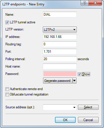 In the following example, the device operating as a L2TP access concentrator (LAC) establishes an L2TP tunnel to an L2TP network server (LNS) with the IP address 192.168.1.66.