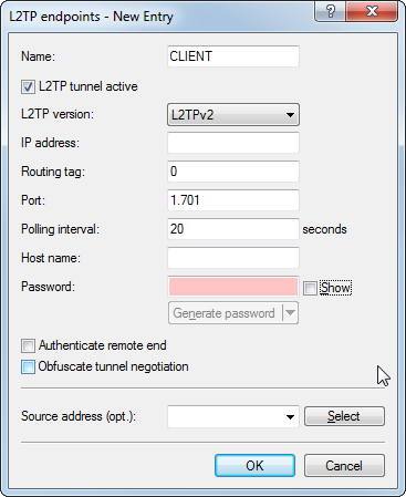 3. Alternatively, you make a separate entry for the RAS client (e.g., "CLIENT") under Communication > Remote sites > L2TP in the L2TP endpoints table.