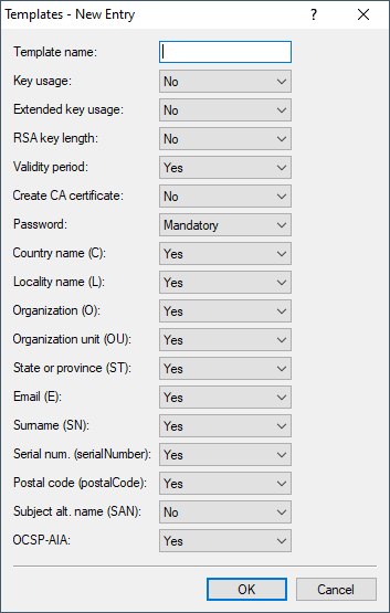 Note: If the Templates table is empty, the user can only see the input fields for the profile name, the common name (CN), and the password. The other profile fields retain the default values as set by the device administrator.