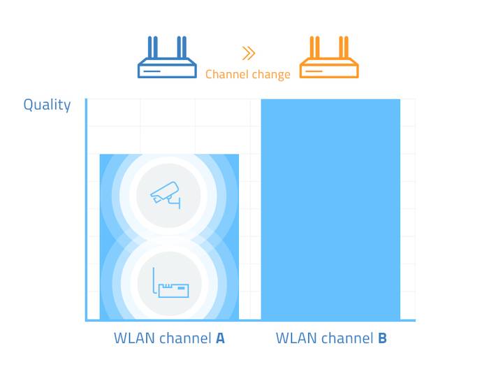 Choosing a WLAN channel specifies which part of the frequency band is used by an access point for its logical WLANs. To ensure the flawless operation of a WLAN within range of another access point, each of the access points should be using a separate channel—otherwise the WLANs have to share the medium. For this purpose, LANCOM access points use the feature Adaptive RF Optimization: The access point permanently scans the radio field for interfering signals. If a threshold is exceeded on the current WLAN channel (by means of the "wireless quality indicators"), the access point automatically switches to a qualitatively better channel. This intelligent feature enables the access point to dynamically adapt to an ever-changing radio field in order to maximize the WLAN’s stability.