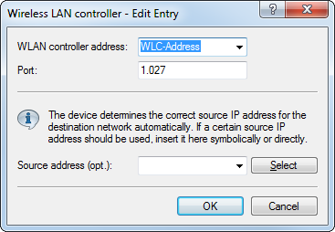 The name or IP address of the WLAN controller is specified here. The name of the LANCOM WLAN controller is preset to 'WLC-Address', so in most cases you do not have to change anything here. If DNS address resolution is not possible, enter the IP address of the WLAN controller here.