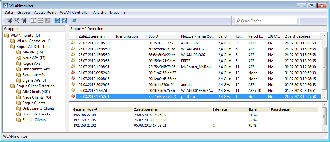 Within each group, WLANmonitor displays the following information about the rogue APs: