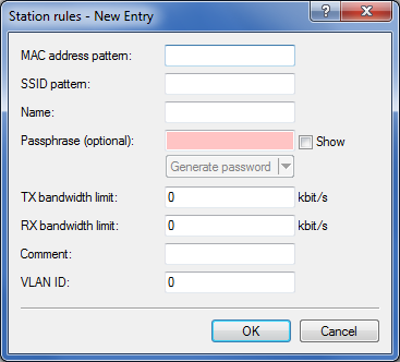 The station rules define which WLAN clients can associate with the WLAN networks of the APs that are centrally managed by the WLC. Furthermore, the method offers a convenient way to give each WLAN client an individual authentication passphrase and a VLAN ID.