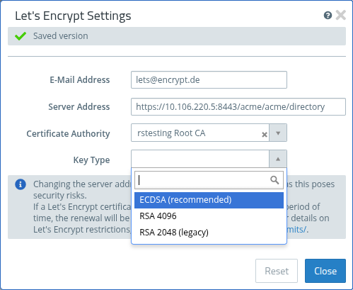 Key Type Select the key type to be used for generating the Let's Encrypt certificates. The available options are ECDSA (recommended), RSA 4096, and RSA 2048 (legacy).