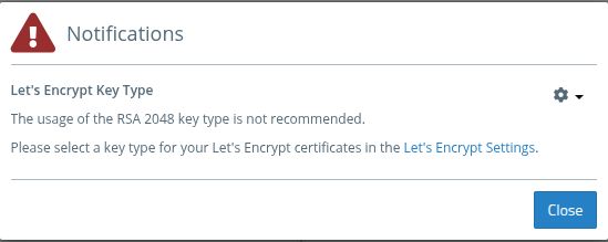 Important: When changing the key type, a confirmation prompt will appear. After confirmation, all previously used certificates that do not match the new key type will be immediately renewed with the new type.