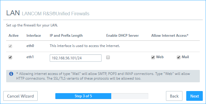 17. Here you configure the local network to which the firewall is (to be) connected. Each line corresponds to a network interface of the firewall (Interface column). You can enable/disable an interface, depending on whether you want to use it or not (Active column). The Internet interface cannot be deactivated. In the field IP and prefix length, enter the IP that the firewall should use on this interface, together with the prefix length (CIDR notation). If you leave the field blank, the firewall will not have an IP connection on this interface. If this is the case, you will be unable to use this interface to access the firewall and you cannot provide a DHCP server, web or mail access for clients connected via this interface. Each interface should have its own subnet. To enable a DHCP server on an interface, select the appropriate checkbox Enable DHCP server. The DHCP pool depends on the firewall IP associated with this port and is preset to the largest continuous range available on the subnet. You can permit typical Internet applications (Web and Mail) for clients connected to an interface by selecting the corresponding checkbox. Web allows clients to connect to the Internet via HTTP. Mail enables SMTP, POP3 and IMAP traffic. This includes the SSL/TLS versions of these protocols.