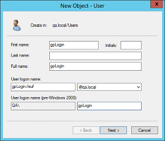 - Under User logon name (pre-Windows 2000) enter gpLogin.