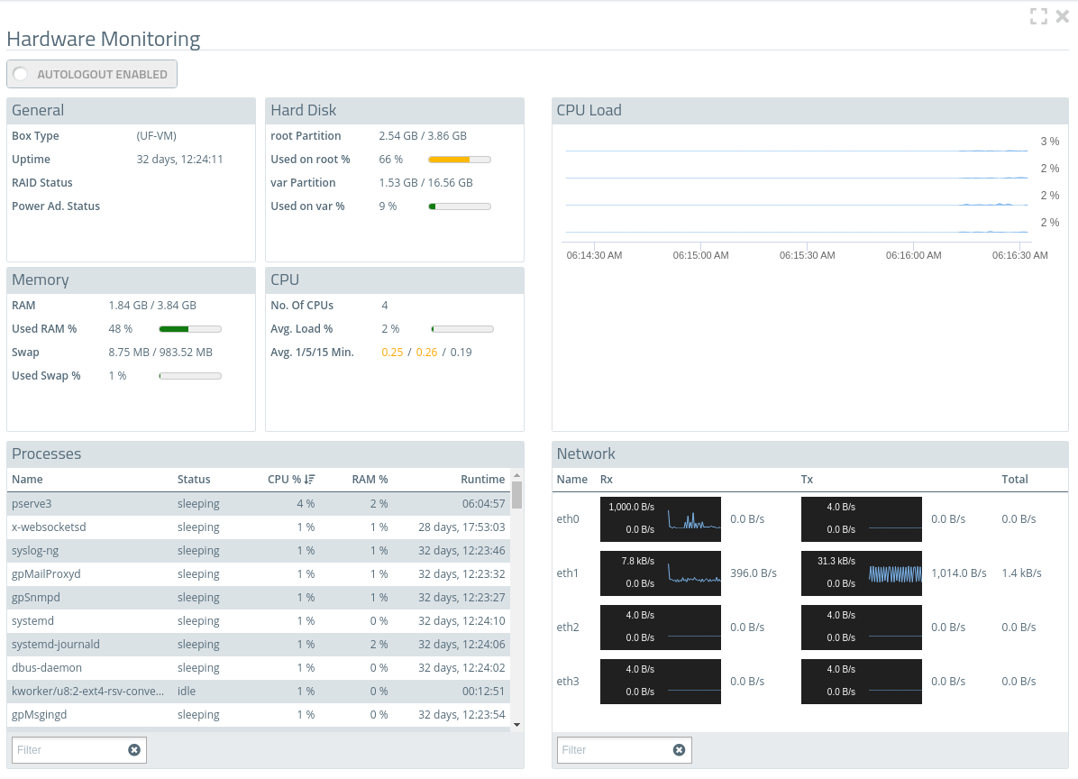 In the Hardware Monitoring edit window, you can view the current status of your LANCOM R&S®Unified Firewall. Data on the following areas is displayed: