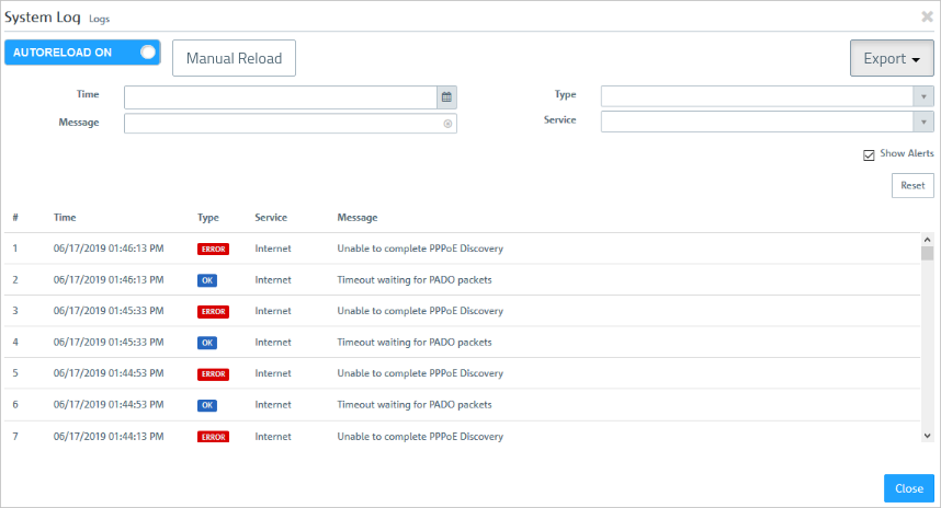 The logs are automatically reloaded to get the latest entries by default. You can disable the automatic reload to focus on older entries by clicking the AUTORELOAD ON slider switch. Click Manual Reload to update the item list bar manually. To enable automatic reload again, click the slider switch.