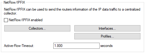 - Defines the interval in seconds after a running data stream is exported via Netflow. This makes it possible to run longer sessions, e.g. to export large downloads at runtime. Subsequent traffic is classified as a new data flow, and the logging of the data traffic by the collector starts again. Possible values: 60–1800 seconds (0 turns the function off)