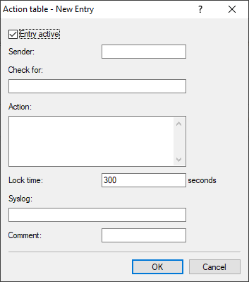 - Defines the action to be executed after checking the specifications under Sender and Check for. For example, exec:smssend -d 7277 -t "Speed" to book a SpeedOn in the Deutsche Telekom network. With exec a command is executed on the command line, in this case the command smssend.