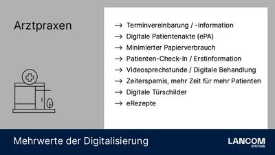 Gesundheitsdienstleister müssen heutzutage zur Versorgung von Patienten eine Vielzahl digitaler Anwendungen in den Praxen nutzen. Telematik und Telemedizin gehören somit zum Arbeitsalltag in den Gesundheitseinrichtungen. Daraus resultierend fordert der Gesetzgeber sichere IT-Lösungen für das Gesundheitswesen, um maximale Sorgfalt beim Umgang mit Patientendaten gewährleisten zu können. Die LANCOM Health-IT-Netzwerklösungen schaffen die perfekte Waage zwischen gewinnbringender Digitalisierung und höchster Cybersicherheit.
