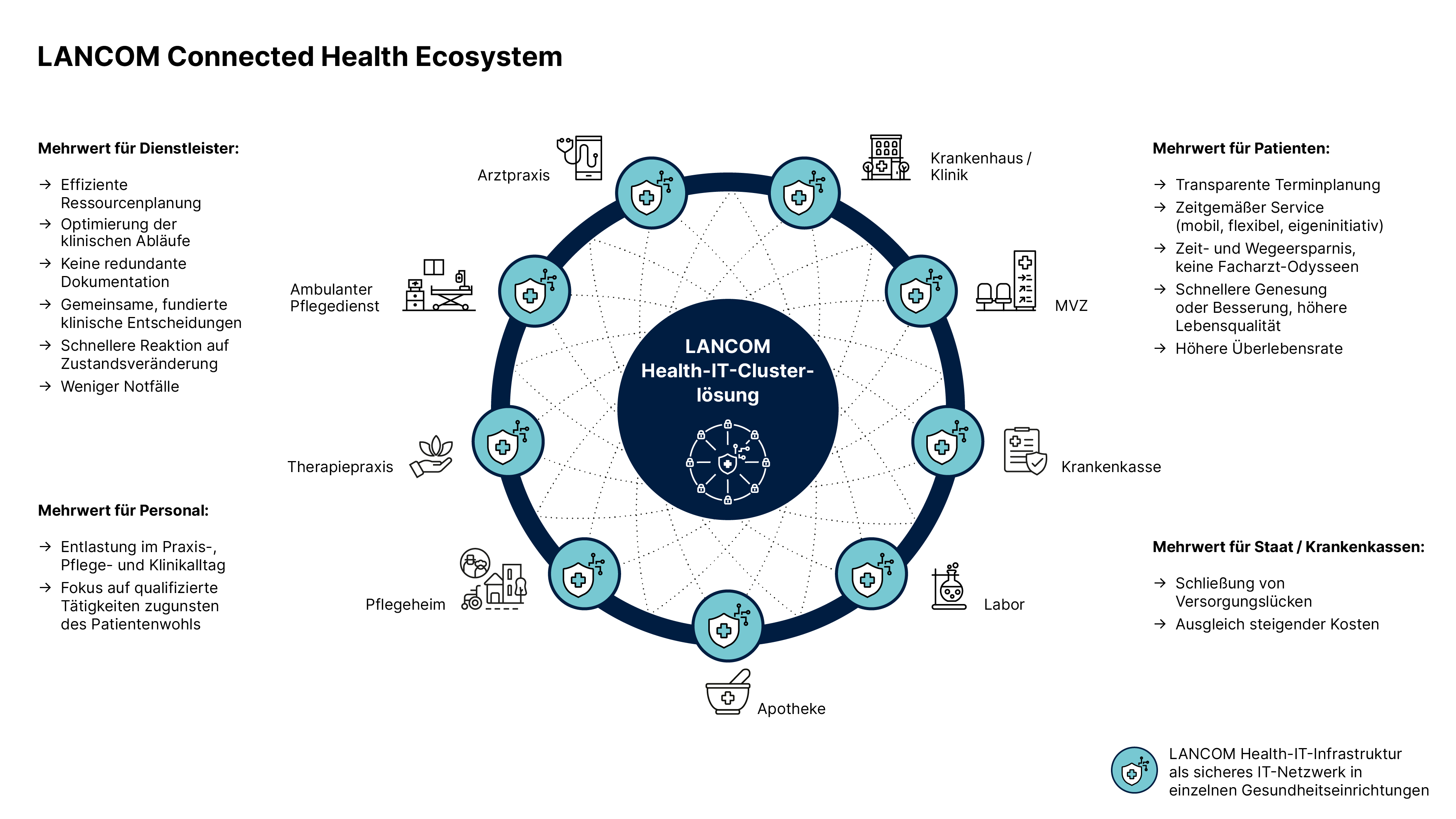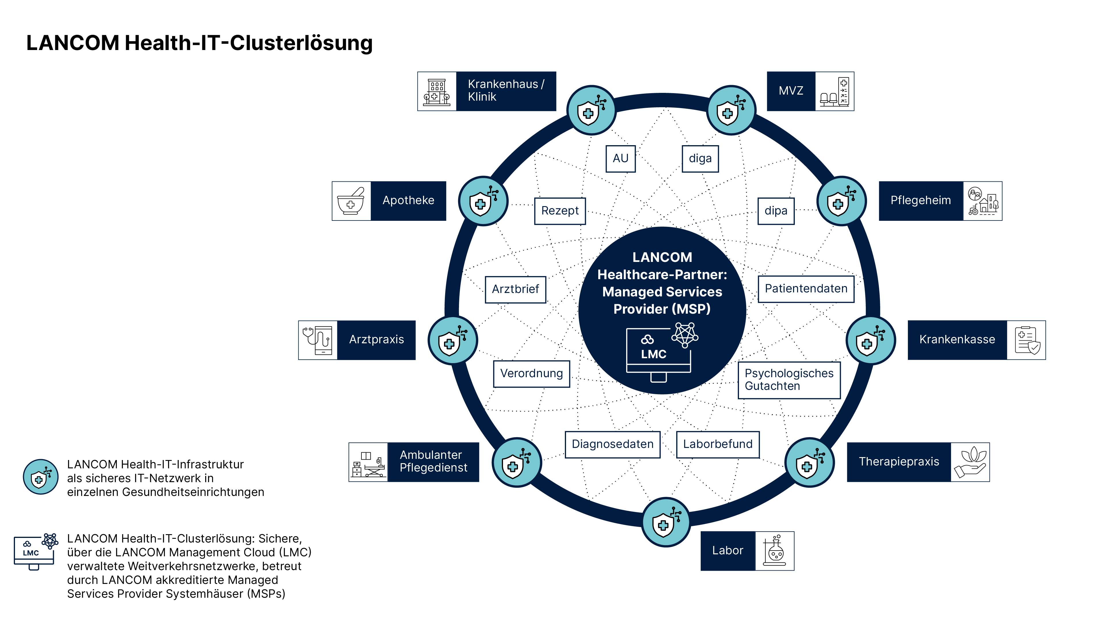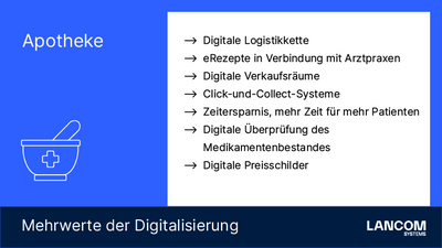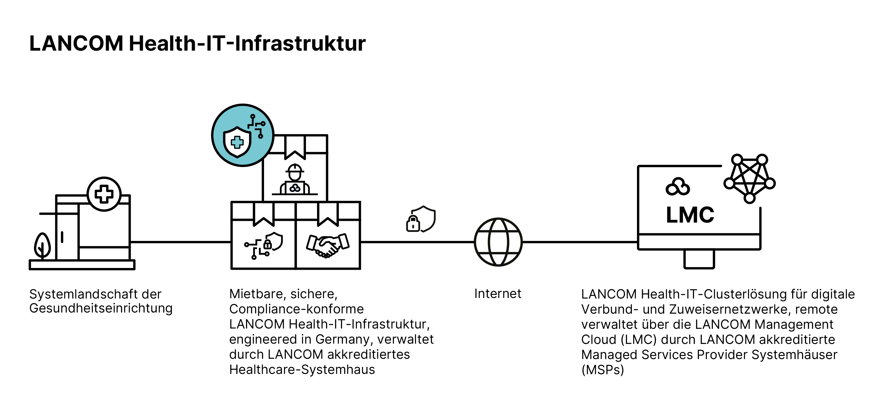 Die LANCOM Health-IT-Infrastrukturen haben einen Cybersecurity-as-a-Service-Ansatz: Sie bieten kauf- oder mietbare individuelle IT-Sicherheitsinfrastrukturen aus Hardware- und Softwarelösungen inklusive Service / Support für verschiedene Gesundheitsdienstleistungsstrukturen. Verfügbar sind sowohl Individualkonzepte als auch standardisierte Pakete für u.a. Einzelpraxen, therapeutische Praxen, Gemeinschaftpraxen, Apotheken, medinizische Versorgungszentren, ambulante Pflegedienste, Kliniken oder Pflegeheime.