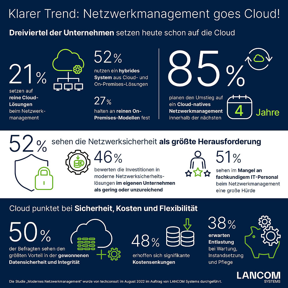 „Homeoffice und COVID-Pandemie haben die Digitalisierung in den letzten 2 Jahren in den Unternehmen noch weiter angefacht. Cloud-Infrastrukturen sind in den Fokus gerückt worden und neue Software-definierte-Lösungen wurden in IT-Bereichen etabliert, die zuvor hardwareseitig für Probleme gesorgt haben. Sie sollen nun die Unternehmen dabei unterstützen, den immer größer werdenden Erwartungen gerecht zu werden. Vor allem im Netzwerkmanagement ist ein Wandel zu erkennen. Unternehmen müssen in der Lage sein, ihre Netzwerke flexibel an neue Leistungsanforderungen anzupassen. [...] Zusätzlich haben sich nicht nur die Arbeitsweisen und Techniken gewandelt. Auch die Anzahl der Geräte in den Netzwerken ist rasant gestiegen. Diese gilt es nun zu identifizieren, zu verwalten und zu verbinden.“ – techconsult Studie aus dem Jahr 2022