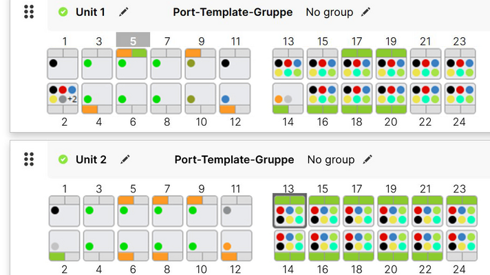 Ohne dass auch nur ein Switch seine Arbeit aufgenommen hat, lassen sich schon zu diesem Zeitpunkt über Templates zu jedem verfügbaren LANCOM Switch-Modell (8-, 10-, 26-Port, etc.) die Portbelegungen festlegen. Das funktioniert wie Smarties verteilen: Per Drag-and-drop werden die farbigen „Pillen“ entsprechend der Farbvergabe im ersten Konfigurationsschritt dem jeweiligen Port-Symbol zugewiesen.