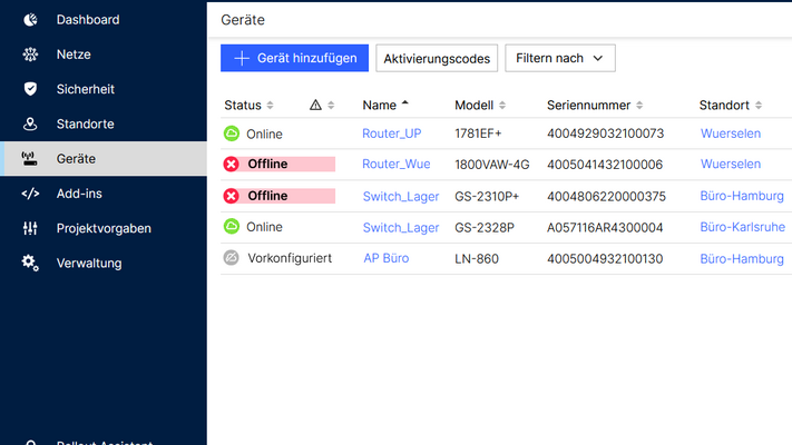 Ein Beispiel: Neue Komponenten können unter dem Reiter „Neues Gerät hinzufügen“ einfach über die Seriennummer und die Cloud-PIN in das Netzwerk eingegliedert werden. Sobald das Gerät dann per Netzwerkkabel am Standort mit der Cloud Tuchfühlung aufnimmt, wird es im System identifiziert und bekommt sofort die ihm zugedachte Konfiguration eingespielt und steht fortan rund um die Uhr unter Beobachtung des Monitorings.
