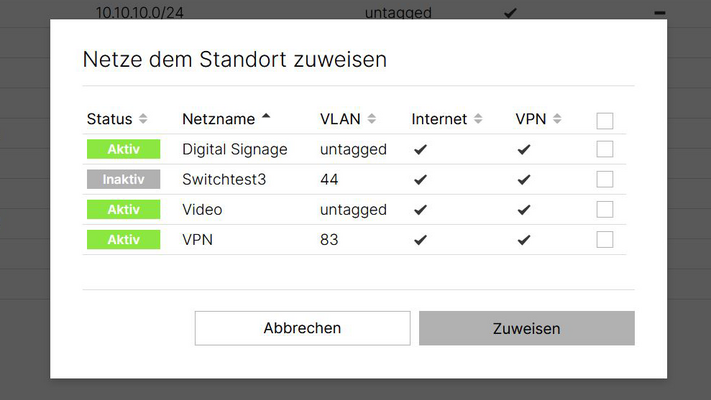 Dann lassen sich Netze mit einem einzigen Klick einem Standort zuordnen. Genial: Einmal angelegte Netze lassen sich so gewissermaßen als „Master-Netze“ nutzen und mit einem Klick auf Standorte ausrollen.
