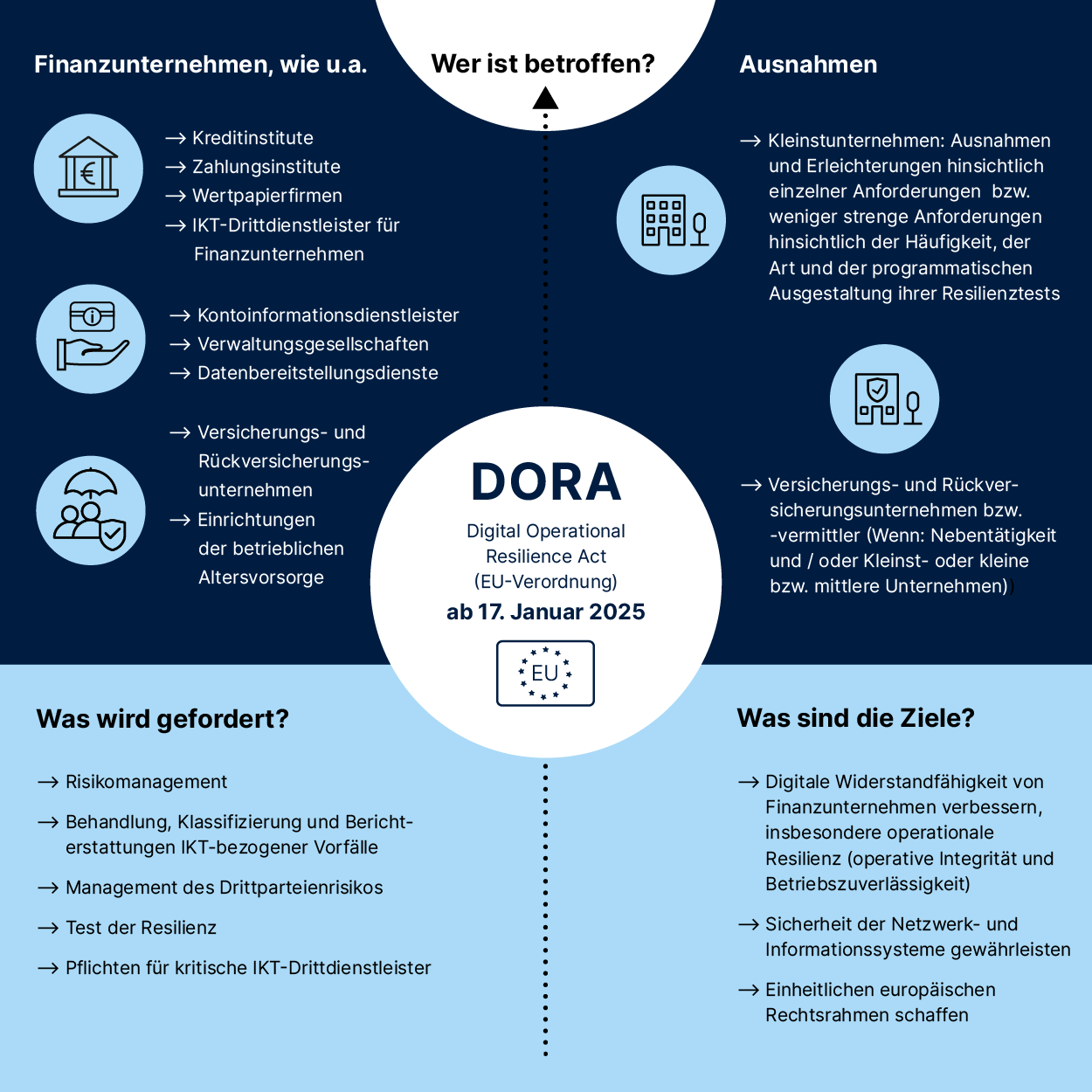 Die entsprechende Vorschrift ist in diesem Fall der „Digital Operational Resilience Act“, kurz DORA. Er soll das Level der Cybersicherheit und digitalen Resilienz im Finanzwesen erhöhen und standardisieren und legt zu diesem Zweck weitreichende IT-Sicherheitsmaßnahmen fest.